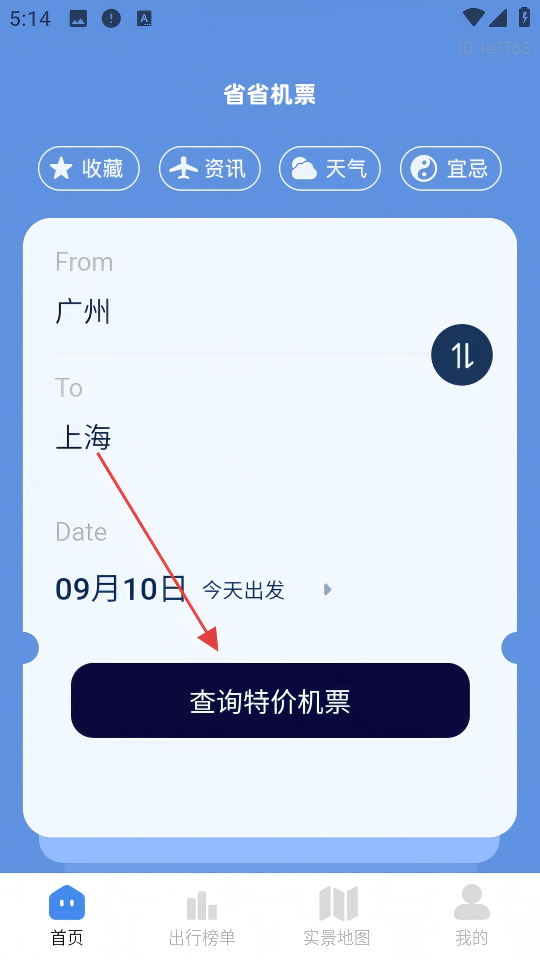 2、进入APP首页,设置出发地、目的地、出发日期。
