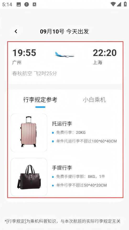 4、选择心仪航班,可查看航班详情及行李规定参考等信息。