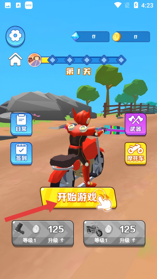 1、在游戏主界面,点击【开始游戏】按钮,即可进入第1关的摩托竞速挑战。