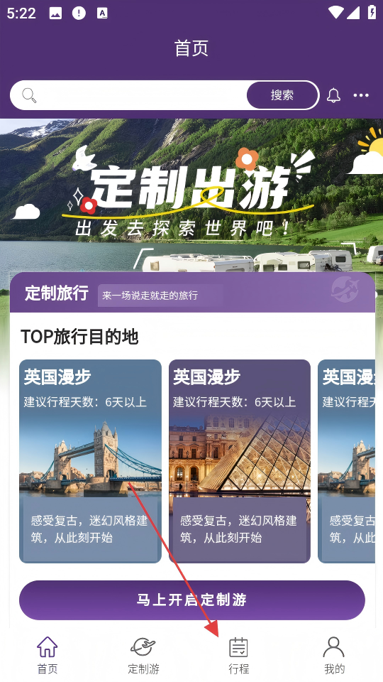 1、打开旅游类APP,点击底部【行程】。
