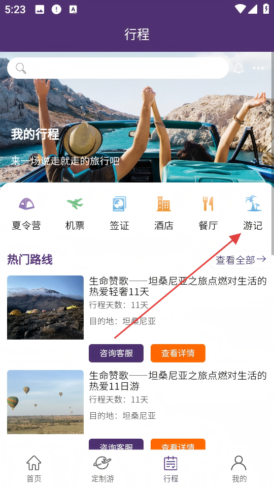 2、进入行程页面,点击【游记】。