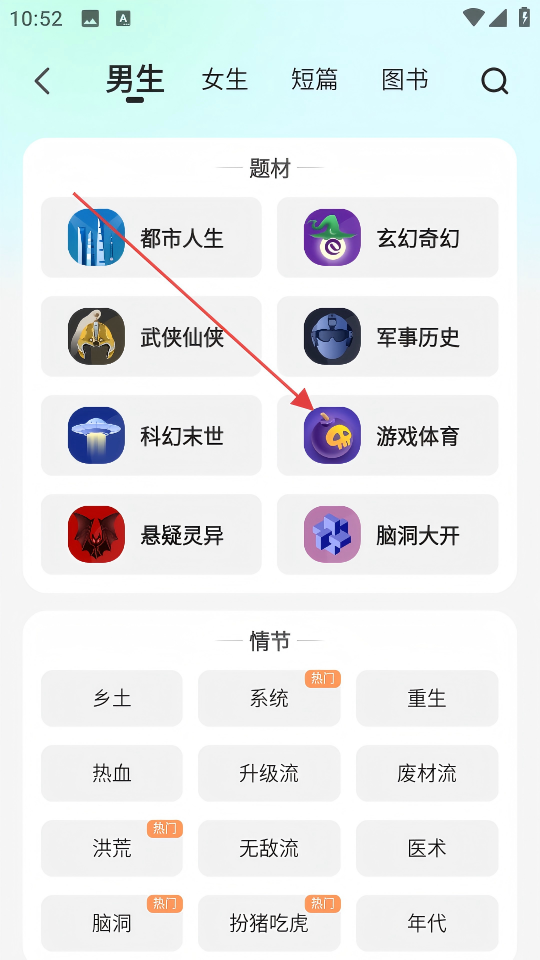 2、进入分类页面,选择“男生”,在题材中点击【游戏体育】。