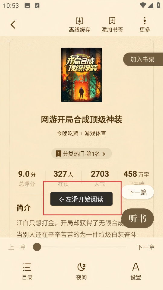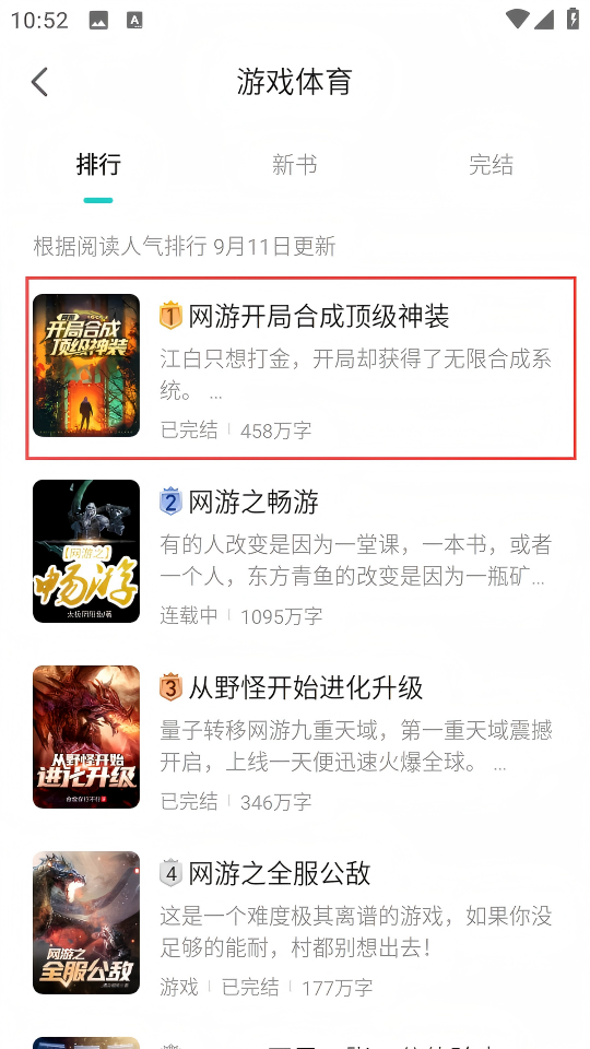 3、进入游戏体育分类页面,点击《网游开局合成顶级神装》小说。