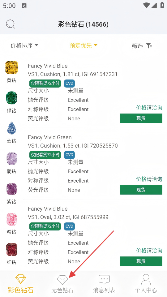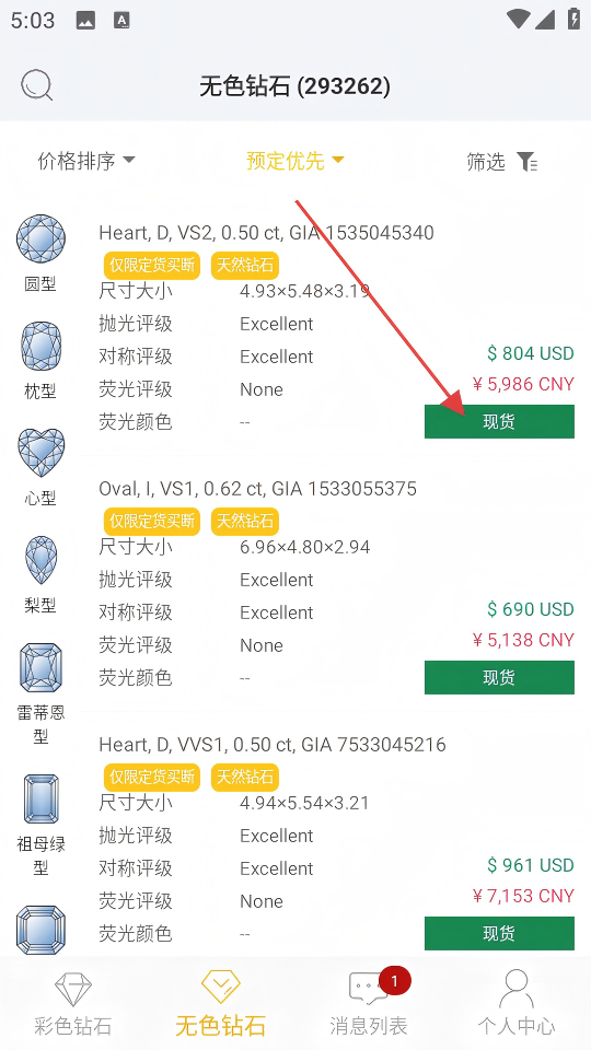 2、查看多种形状的无色钻石,了解价格、尺寸大小等,点击现货。