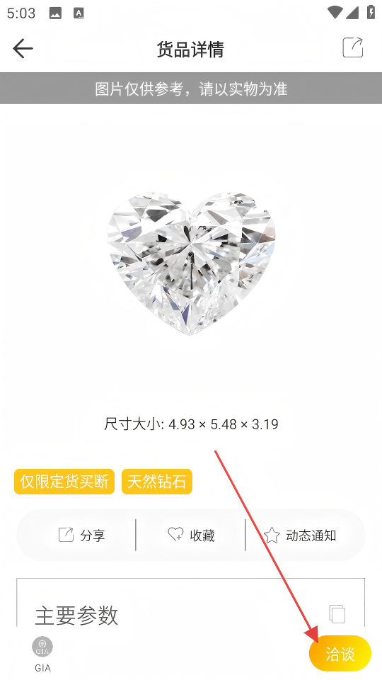 3、点击感兴趣的钻石,进入货品详情页,可查看钻石图片,点击“洽谈”。