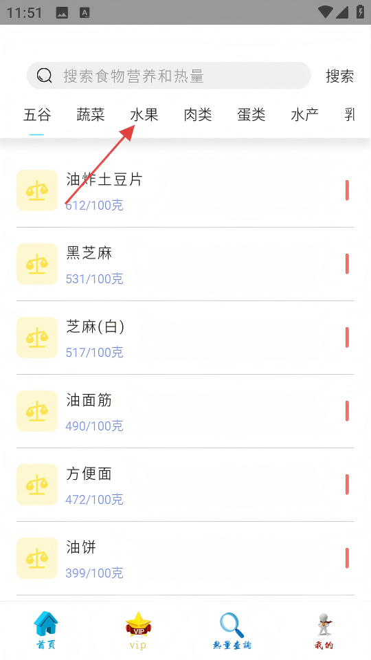 2、在热量查询页面,可选择食物分类,如【水果】。