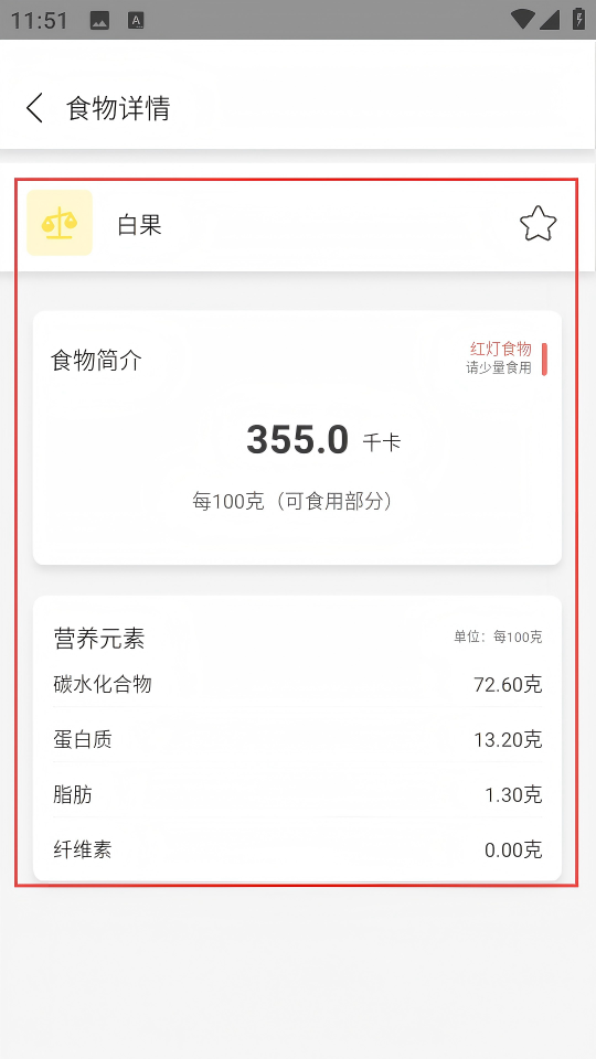 4、进入食物详情页面,可查看该食物的热量及碳水化合物等营养元素含量。