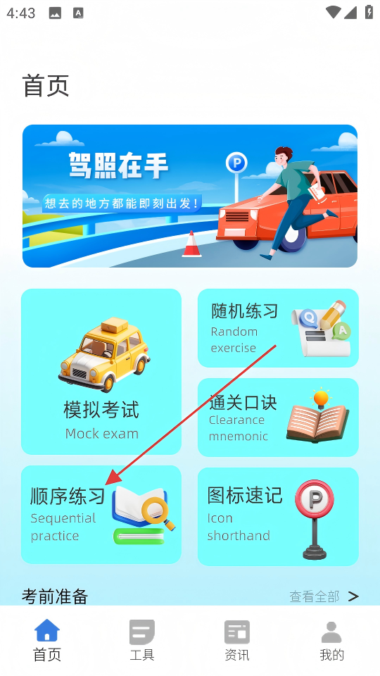 1、进首页,找到【顺序练习】,点击进入练习设置。