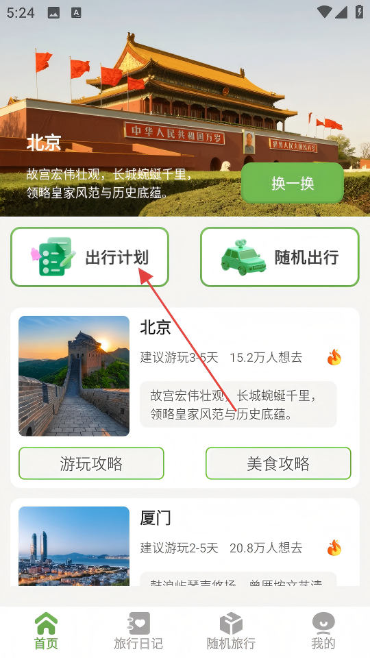 1、进入APP“首页”,点击“出行计划”进入页面。
