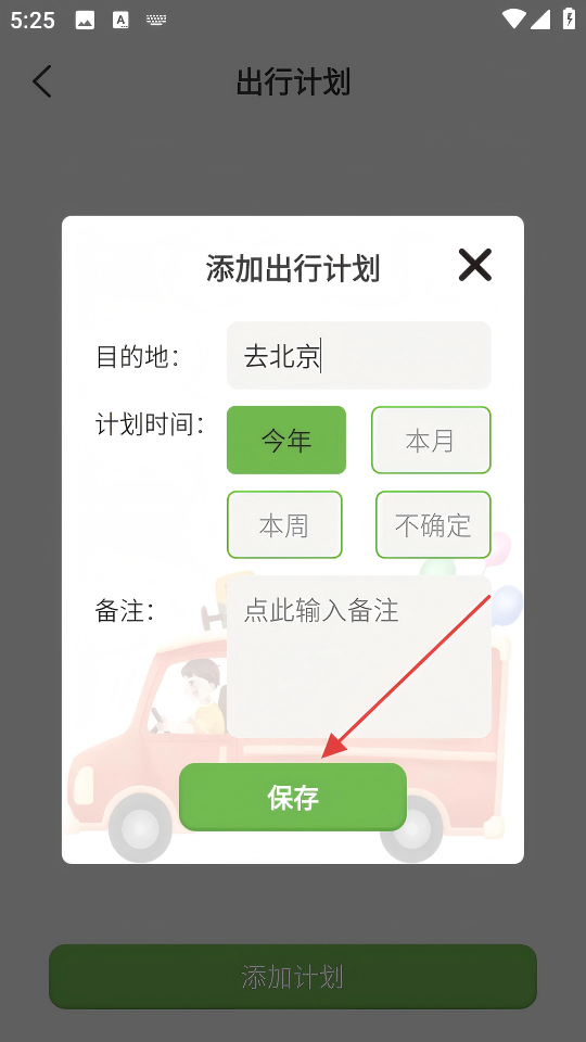 3、在“添加出行计划”弹窗中,设置目的地,选择计划时间,点击“保存”。
