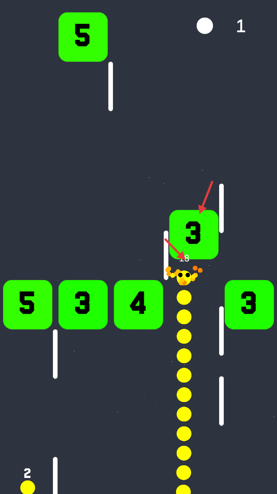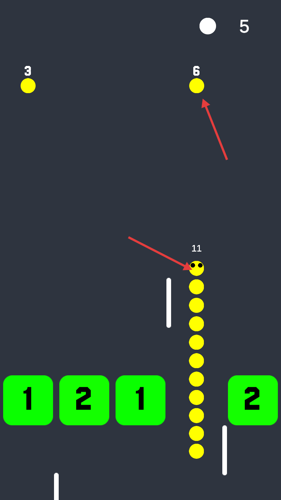 3、用增长后的蛇形物体撞击绿色数字方块,使其数字减少。