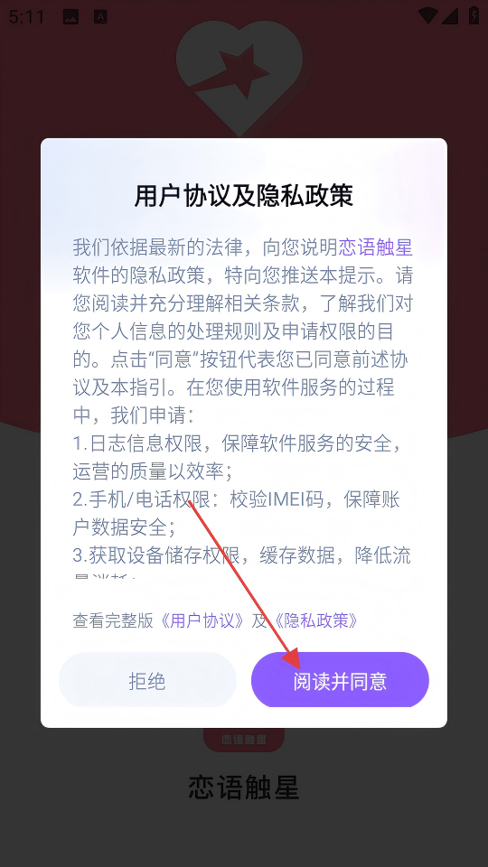 1、首次使用恋语触星APP,需阅读【用户协议及隐私政策】,点击【阅读并同意】。