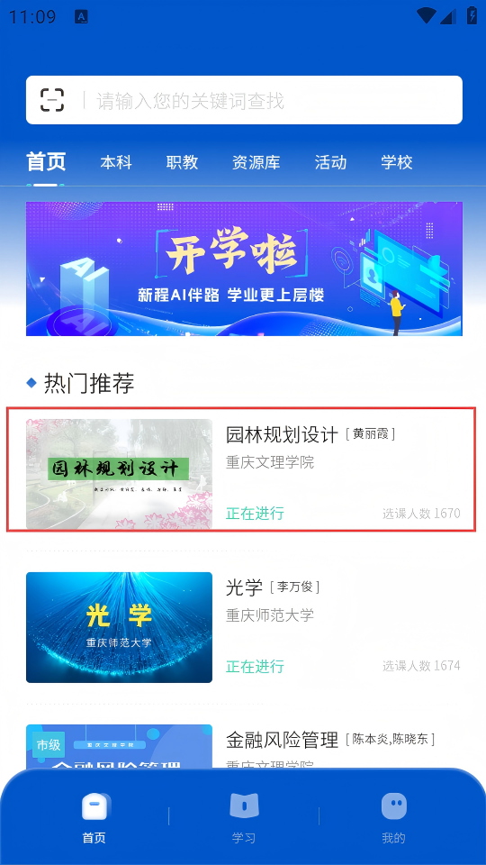 1、进入APP首页,可在热门推荐中选择感兴趣的课程,如【园林规划设计】。