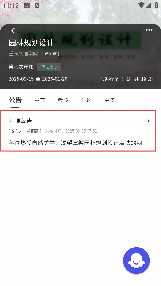 3、在学习页面,可查看公告、章节、考核等内容,点击【开课公告】,查看公告详情。