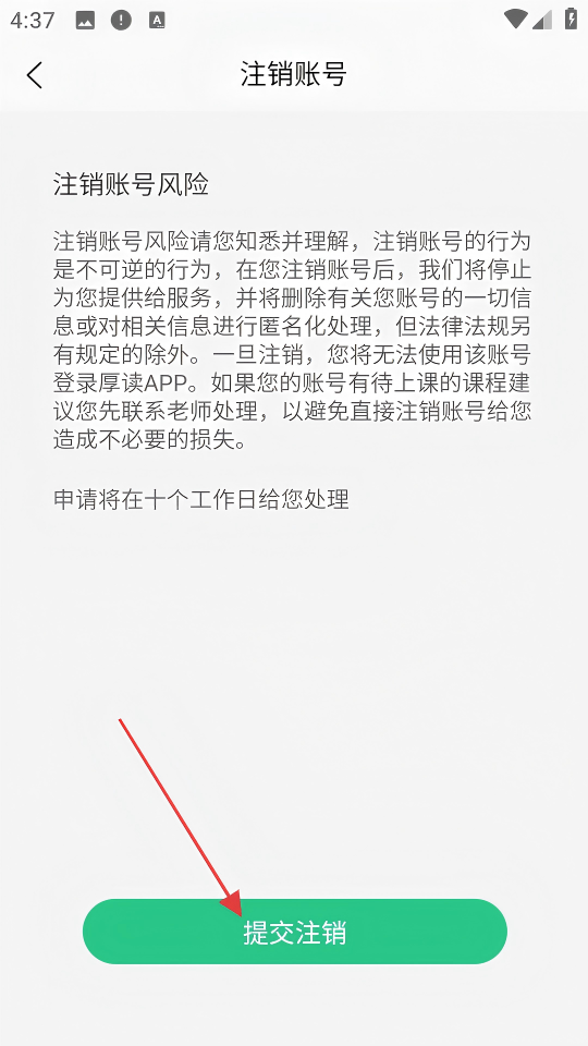 4、阅读注销账号风险提示,确认后点击【提交注销】。