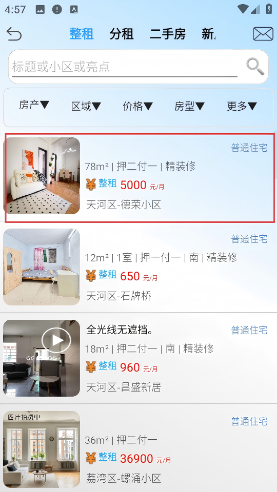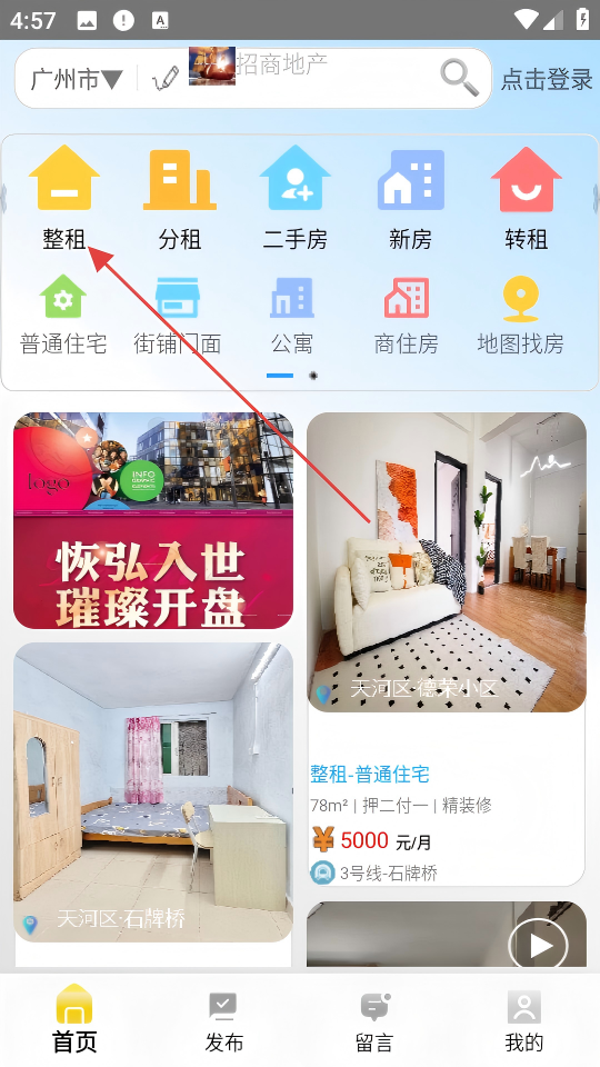 1、进入软件首页,点击【整租】选项,可看到各类整租房源展示。