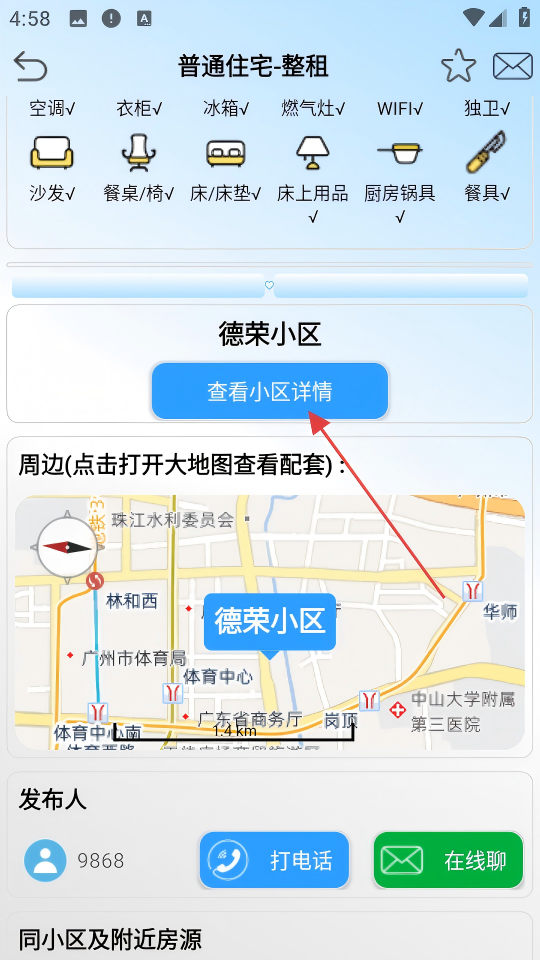 2、在整租房源列表里,挑选感兴趣的房源点击,能查看该房源的面积、价格、位置等详细信息。