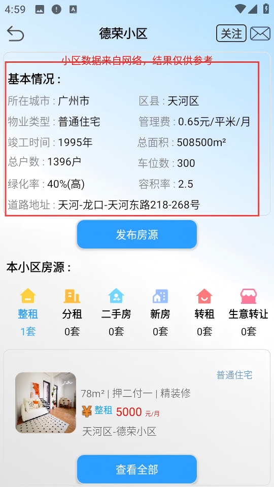 4、在小区详情页,能查看小区基本情况,像所在城市、物业类型、绿化率等信息。