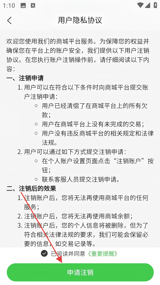 4、仔细阅读内容后,点击【申请注销】完成账号注销。