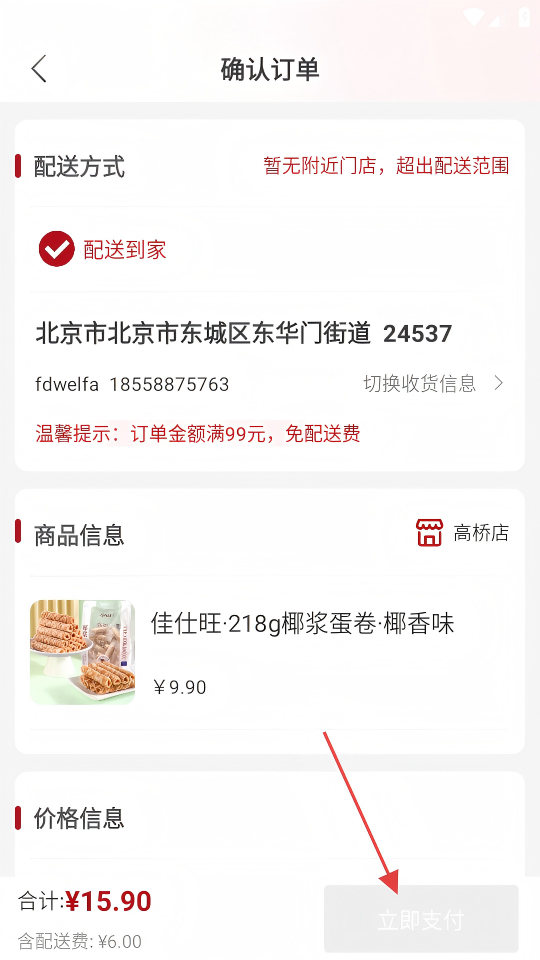 4、进入确认订单页,核对配送方式、收货信息及商品信息后,点击【立即支付】完成购买。