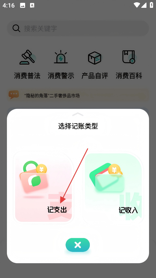 2、在弹出的“选择记账类型”弹窗里,点击【记支出】选项。