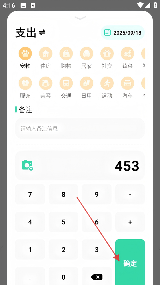 3、进入支出记录页,选择消费分类(如【宠物】),输入金额后点击【确定】按钮。