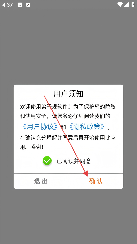1、在“弟子规软件”的【用户须知】弹窗中,点击【确认】按钮,进入软件主界面。