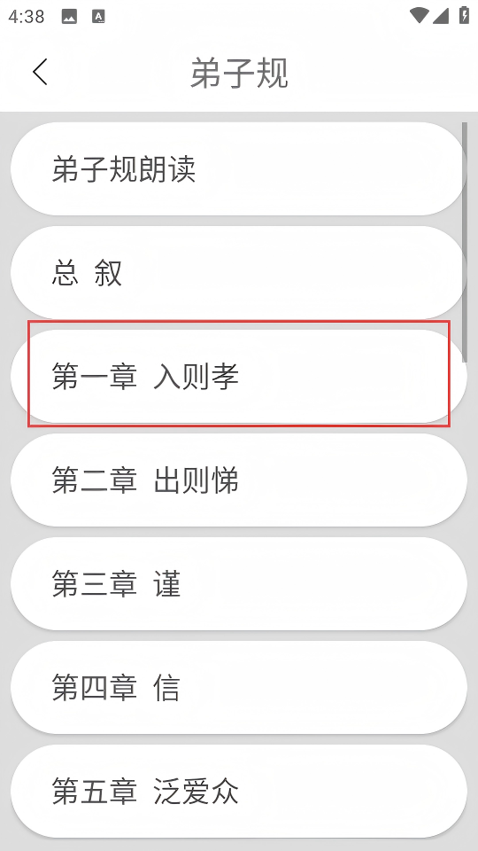 3、在弟子规章节选择页面,点击【第一章入则孝】选项,进入该章节内容页。