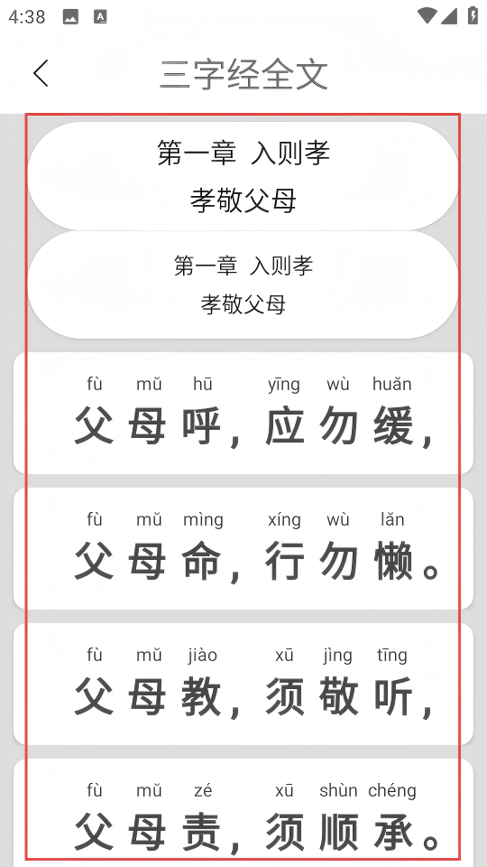 4、进入【第一章入则孝】内容页后,即可查看带有拼音标注的“父母呼,应勿缓”等具体内容。