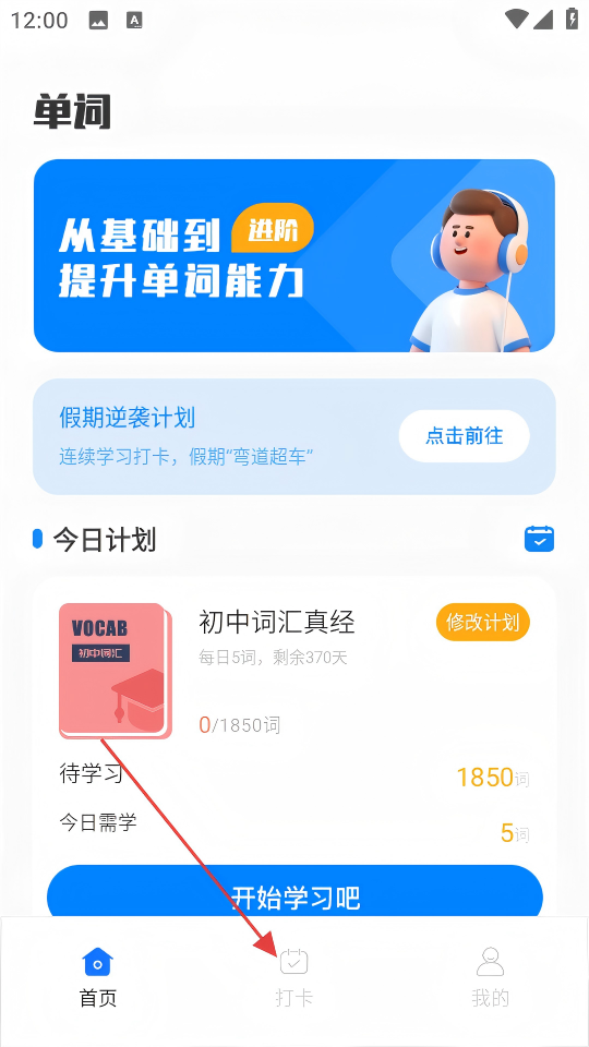 1、进入单词学习APP后,点击底部的【打卡】选项,进入打卡页面。