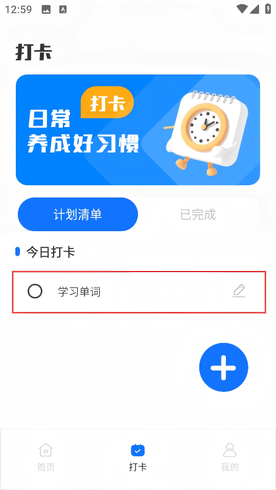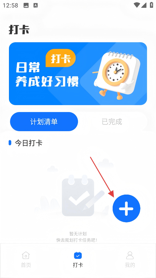 2、在打卡页面,点击蓝色的【+】按钮,进入创建打卡页面。