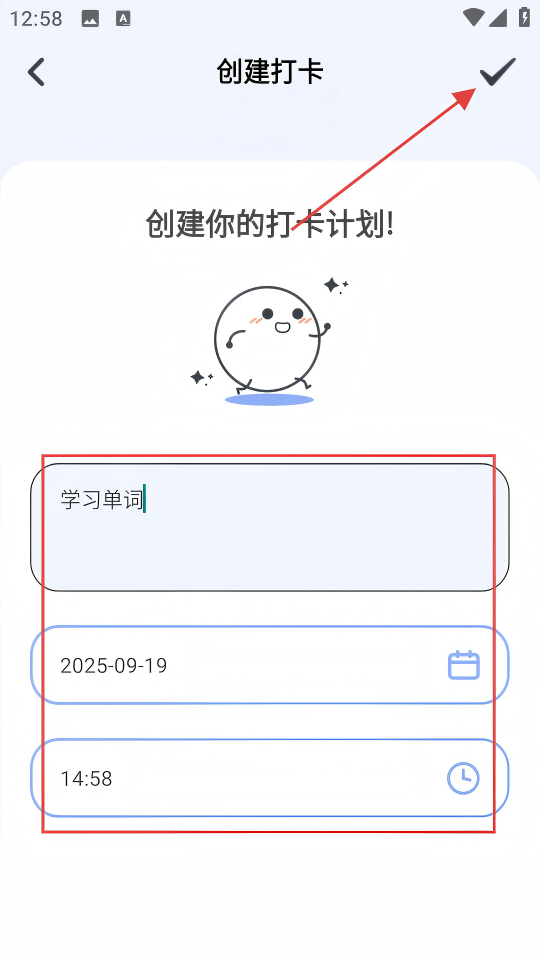 3、在创建打卡页面,填写打卡计划内容,设置日期和时间,然后点击右上角的对勾图标,完成打卡计划创建。