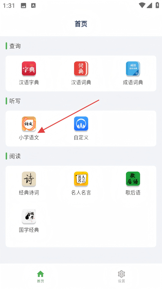 1、进入APP首页,在“听写”板块点击【小学语文】选项,进入小学语文课文选择页面。