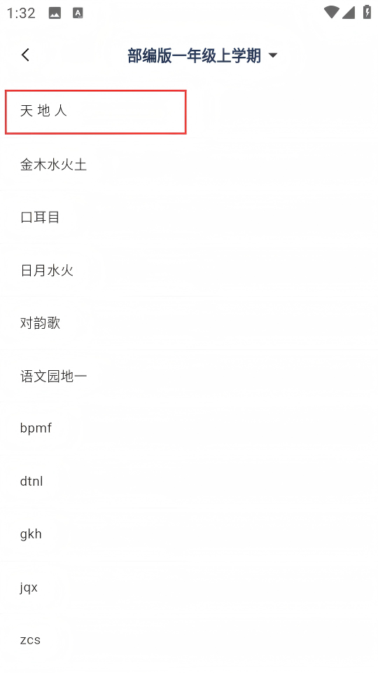 2、在“部编版一年级上学期”的列表中,点击【天地人】课文,进入该课文的听写准备页面。