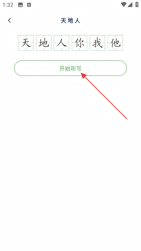 3、在“天地人”课文的听写准备页面,点击【开始听写】按钮,进入听写页面。