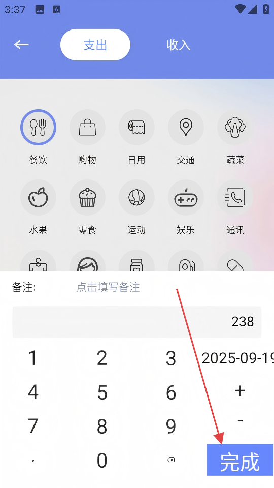 3、选择支出类别,输入金额后点击【完成】,记录支出。