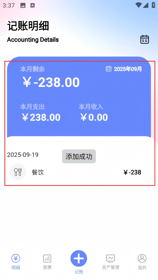 4、完成记账后,记账明细页面会显示添加成功的记录。