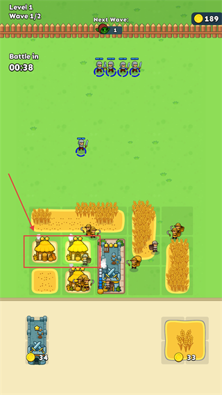 2、放好房屋会自动生士兵和农民,农民去麦田收小麦换金币,金币够了解锁新建筑扩展领地。