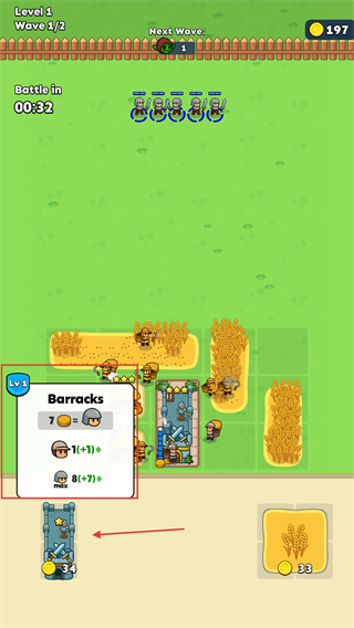 2、解锁【Barracks】兵营后,选择合适等级的士兵,搭配建筑布局增强防御应对敌人进攻。
