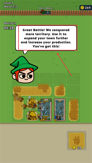 1、合理放置【麦田】-【房屋】等建筑,农民收割小麦转化为金币,积累资源解锁新设施扩张领地。