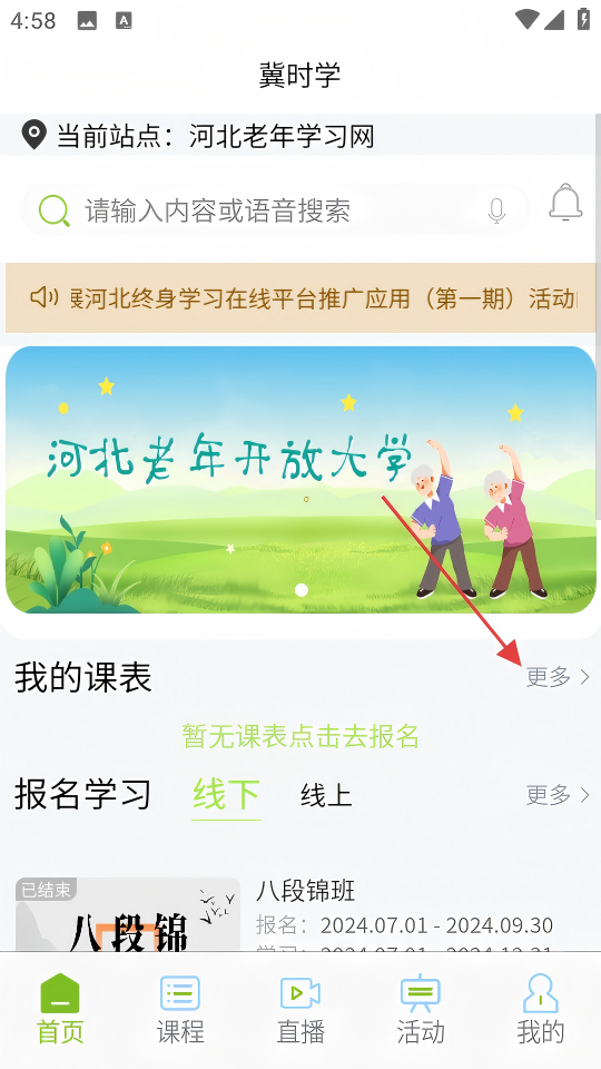 2、在冀时学页面,点击【我的课表】右侧的【更多】,查看课程列表。