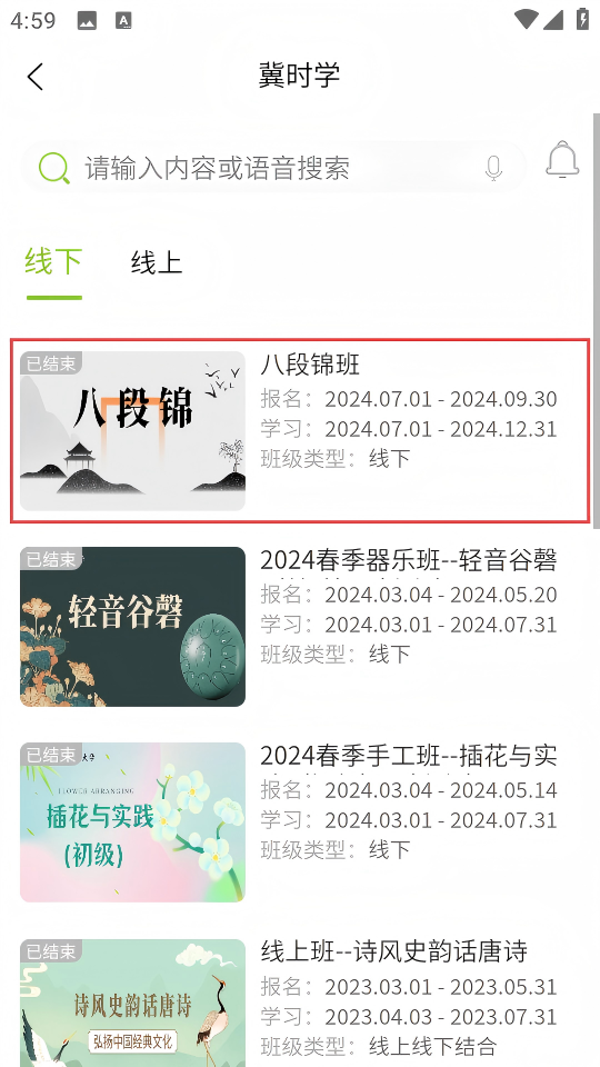 3、在课程列表中,点击【八段锦班】,进入学习班详情页。