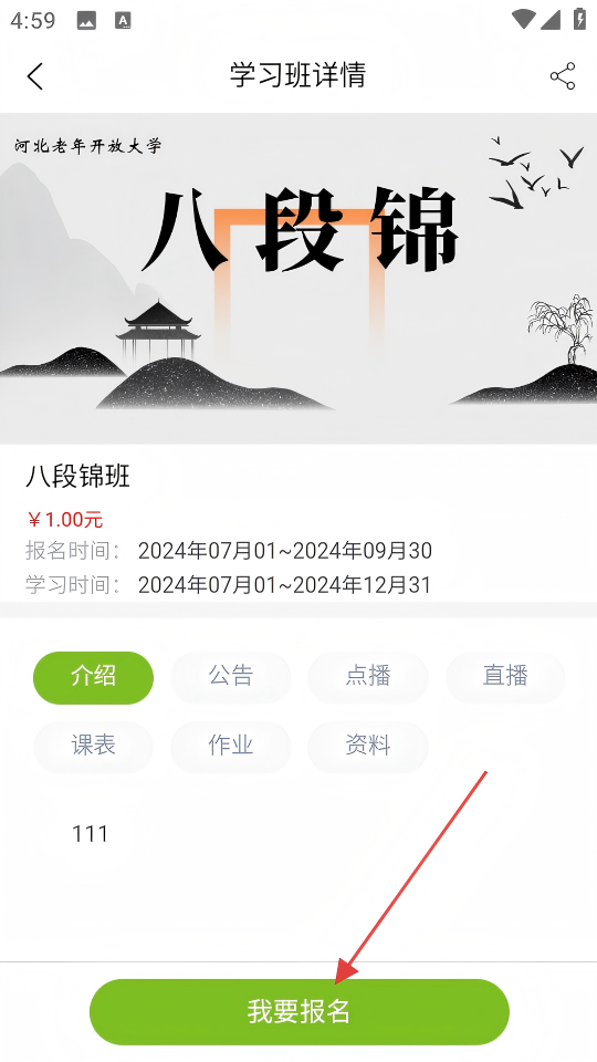 4、进入【八段锦班】学习班详情页后,点击底部【我要报名】按钮,进行报名操作。