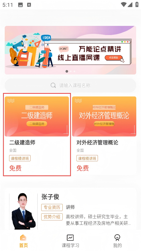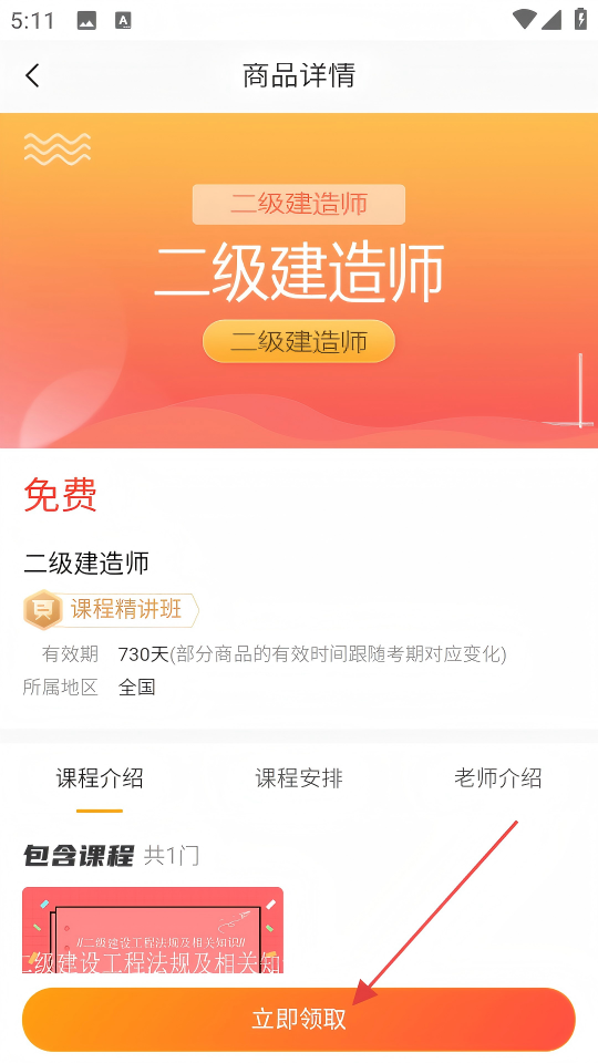 1、进入APP首页,点击【二级建造师】课程卡片,进入该课程商品详情页。