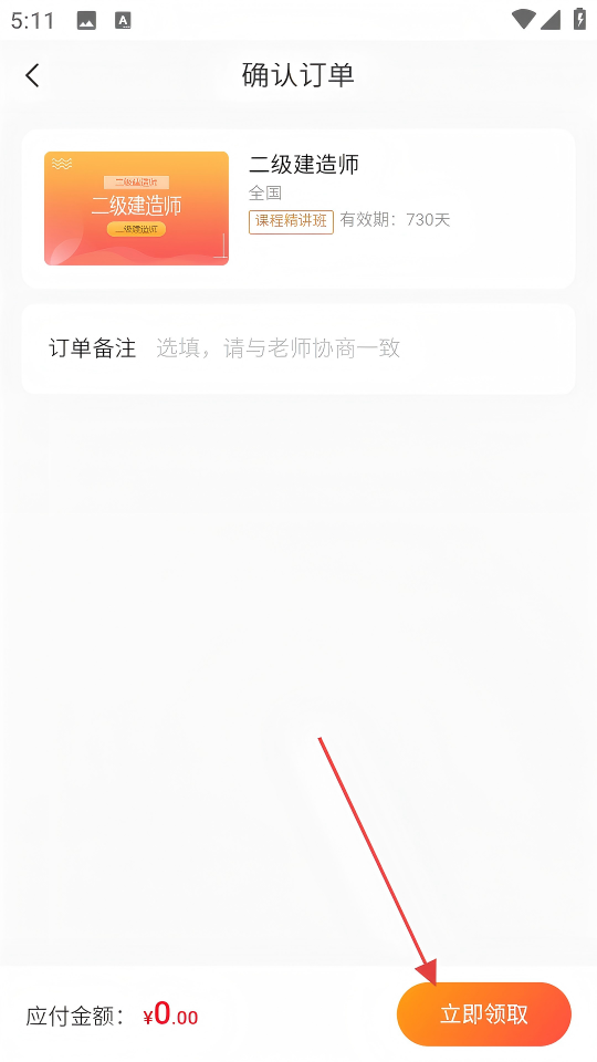 3、在确认订单页面,点击【立即领取】,完成课程领取。