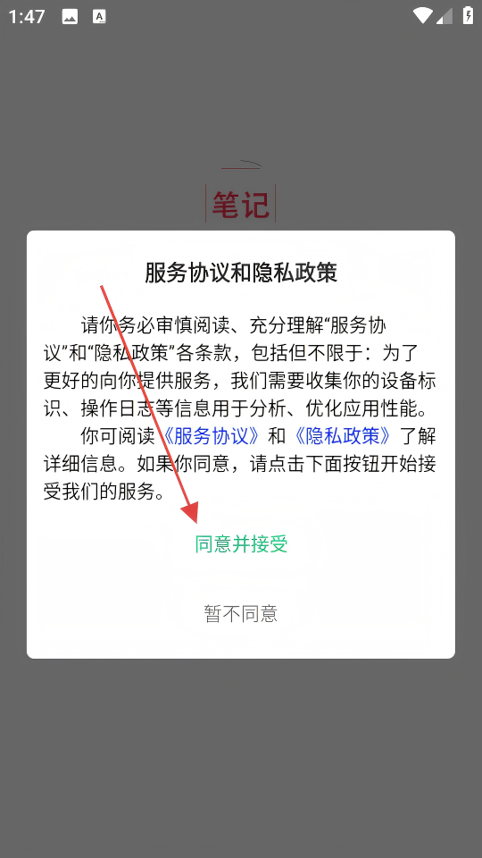 1、打开APP,仔细阅读相关内容后,点击【同意并接受】,进入APP首页。