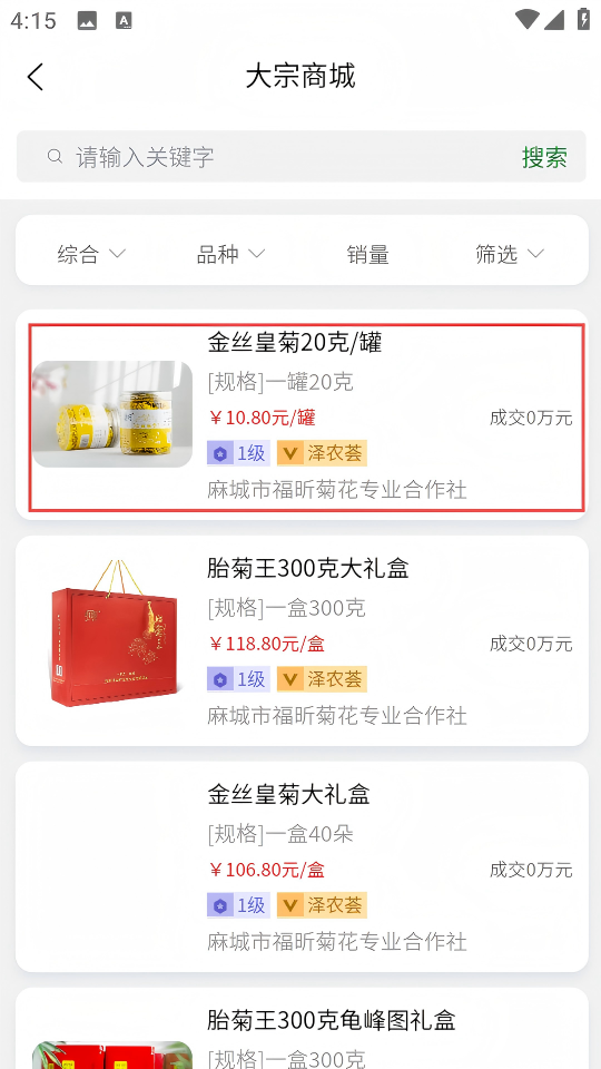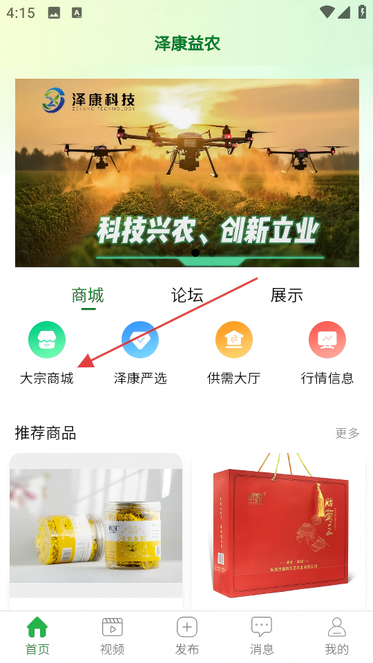 1、打开“泽康益农”APP,进入首页后,点击【大宗商城】选项,进入大宗商城页面。