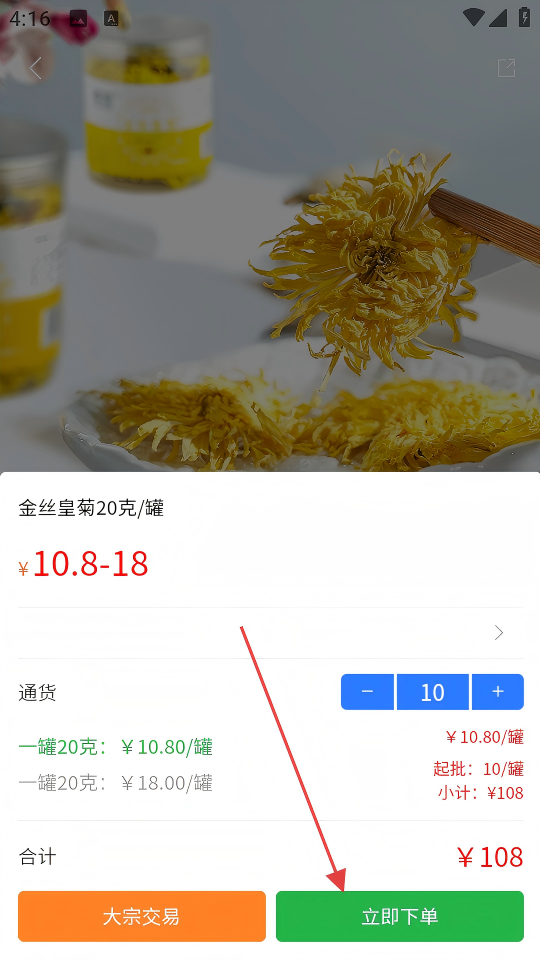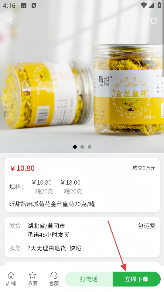 3、在商品详情页,点击【立即下单】按钮,进入下单页面。
