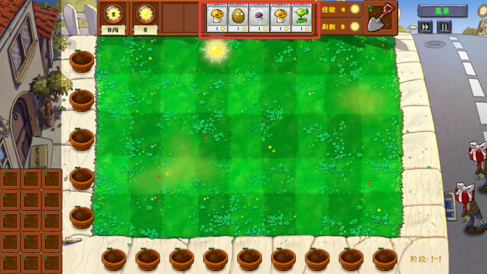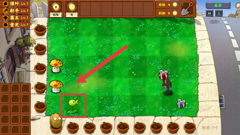 1、关卡开始时,根据阳光数量合理选择红框内的植物,如蘑菇、土豆等,规划植物种植布局。