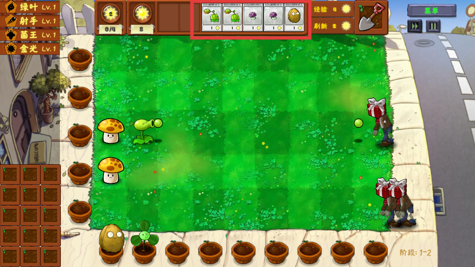 4、根据关卡进度和僵尸情况,调整红框内的植物选择,搭配出合适的植物阵容,抵御僵尸进攻。